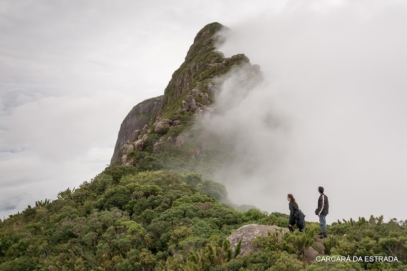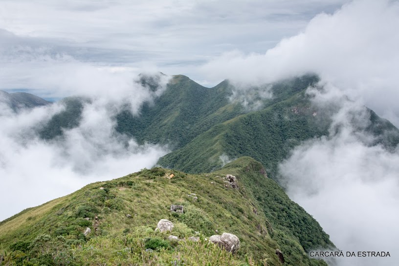 Não me deixei abater pelo cenário nebuloso que encontrei ao deixar a barraca ao amanhecer. Tudo permanecia cinza, mas felizmente não chovia. Embora a intenção fosse registrar a Baía de Antonina e boa parte do litoral norte do Paraná do ponto mais privilegiado do Estado, a impossibilidade me lembrou que os desígnios da natureza são alheios às nossas vontades. Foi uma grande honra estar ali por alguns momentos. Sem a luz direta do sol e sem esperanças de que o tempo se abrisse, levantamos acampamento, juntamos nossas tralhas e nos recolocamos no caminho de volta à fazenda Pico Paraná. Enfrentamos todos os perigos novamente, avançando mais vagarosamente do que na ida, visto que Luana, em um dos abissais barrancos em meio à mata atlântica, torcera o joelho e reclamava de lancinante dor. O ponto alto do regresso, além da sempre deslumbrante – e parcial – vista da Serra de Ibitiraquire (Serra Verde, em tupi), foi o reencontro com Erlon Junior, motociclista de São Paulo e companheiro de Pantanal Sul (link da viagem) que também caminhava por aquelas bandas. Após 7 horas de caminhada reavíamos nossas motos na fazenda e, sobre elas, praticamente exauridos de nossas forças, retornamos a BR-116, onde pernoitamos à beira da estrada. Certamente esse é um local ao qual regressarei em breve, já que existem, além do Pico Paraná, outros cumes acessíveis por trilhas na mesma serra. As possibilidades ali são muitas.