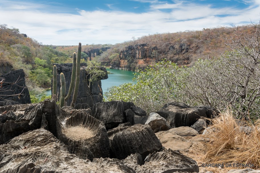 A madrugada do dia 20 sacramentou minha primeira pernoite no sertão nordestino. E para que o dia germinasse todo o seu potencial, carecia eu de um guia, uma vez que todos os atrativos de São Desidério demandam-no. Exigências da prefeitura. Na praça central conversei com Junior do Jatobá, um guia credenciado que estava de partida para a Lagoa Azul, onde se encontraria com um pessoal da UNEB (Universidade do Estado da Bahia). Em duas motos seguimos por uma estrada de chão, a mesma que eu utilizara para ir de Jaborandi a São Desidério, por cerca de 15km, e então adentramos uma arenosa via rural até a portaria do Parque Municipal da Lagoa Azul. Aguardamos um bocado e o ônibus com 30 universitários assomou. Fomos divididos então em dois grupos e comecei a caminhada juntamente com o primeiro, numa trilha bem demarcada em meio ao cerrado do oeste baiano. Existe aqui uma grande incidência de barrigudas, uma árvore de grande porte, algumas chegando a 20m de altura. O curioso é que, quando despencam, são extremamente leves. Quatro homens medianos são suficientes para carregá-la. Em menos de 500m estávamos derredoreando a Lagoa Azul, verde, na verdade, um imenso e plácido manto d'água com 15 metros de profundidade, formado no curso do rio João Rodrigues. É parcialmente emoldurada por paredões de calcário, lapiás e cactus. Toda essa água, logicamente, não fica estagnada aqui. Ela subterraneamente passa pela Gruta do Catão, uma galeria natural calcária de mais de 100m de comprimento, ressurgindo no extremo oeste do parque, onde um outro cânion a guarnece.